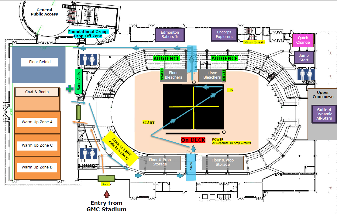 Note: IT IS CRITICAL THAT GROUPS DO NOT ENTER THE WARM UP SPACE PRIOR TO THEIR DESIGNATED TIME and that GROUPS EXIT AT THEIR DESIGNATED TIME. This is in the interest of everyone's safety by reducing the chaos in the space. GROUPS THAT VIOLATE THIS MAY BE DISQUALIFIED AND/OR HAVE PRIVILEGES REVOKED AT FUTURE EVENTS.