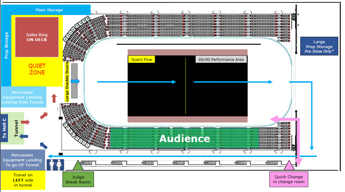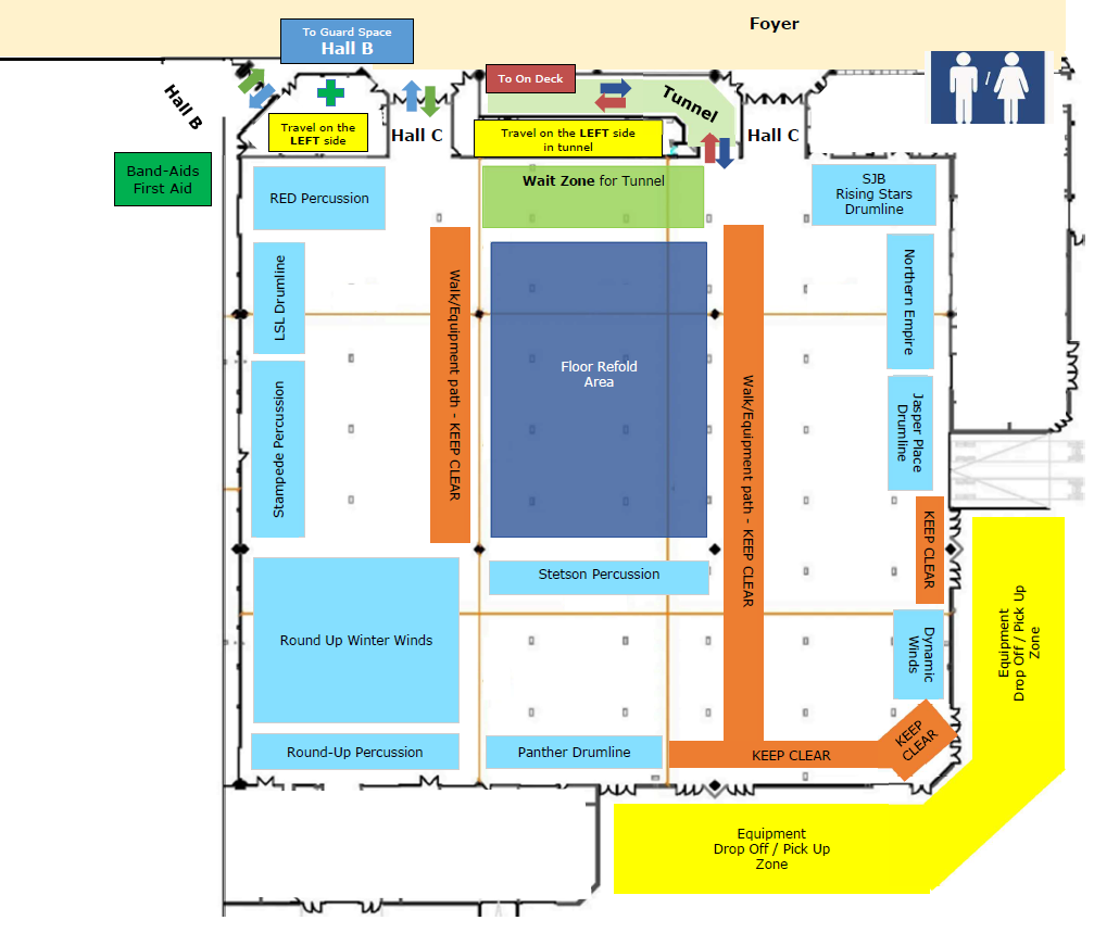 All floors, percussion equipment and props will be unloaded into Hall C. Trucks/Trailers may back up to the doors in this area for easy unload.