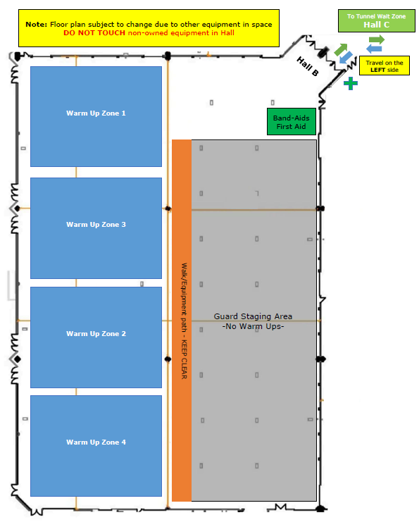 Note: IT IS CRITICAL THAT GROUPS DO NOT ENTER THE WARM UP SPACE PRIOR TO THEIR DESIGNATED TIME and that GROUPS EXIT AT THEIR DESIGNATED TIME. This is in the interest of everyone's safety by reducing the chaos in the space. GROUPS THAT VIOLATE THIS MAY BE DISQUALIFIED AND/OR HAVE PRIVILEGES REVOKED AT FUTURE EVENTS.