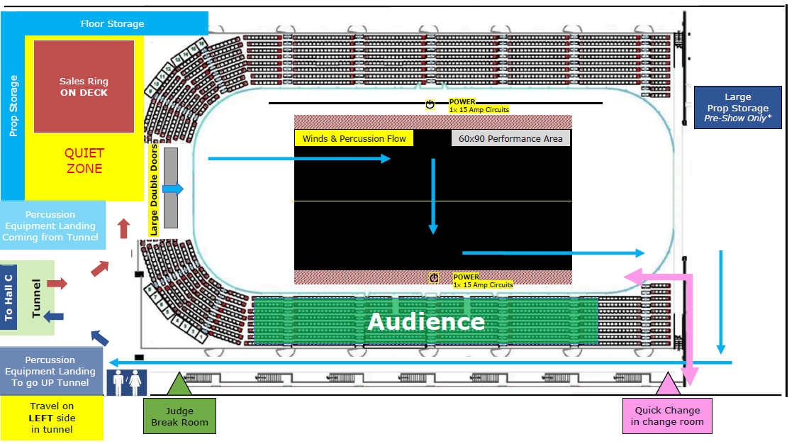 Percussion & Winds: schedule allows for lengthy warm ups in Hall C. Percussion and Winds warm ups are scheduled with sound overlap. Please self-monitor and move to the tunnel when appropriate for your group.