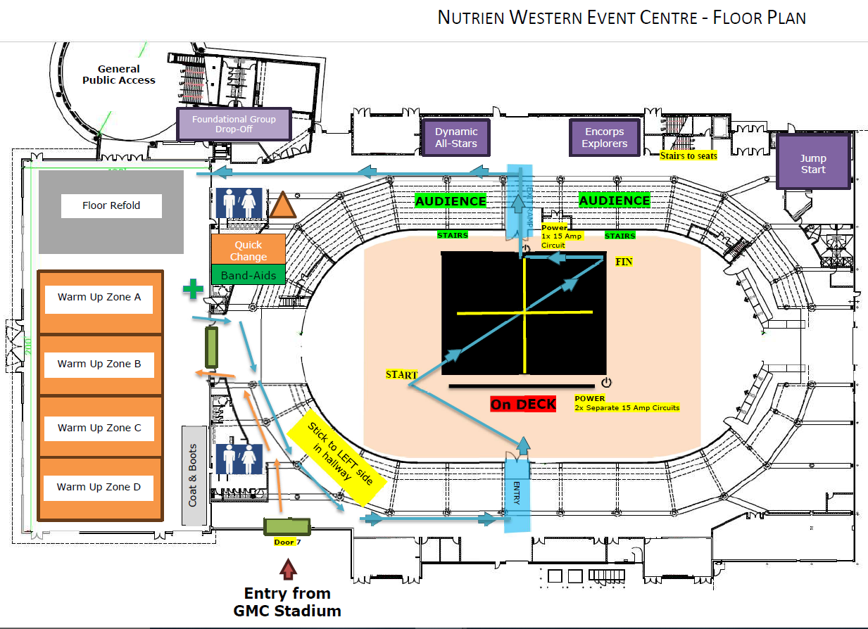 Performers should arrive at GMC Stadium anytime after 11:00AM || Encorps Explorers, Dynamic All-Stars and Jump Start should arrive at Nutrien Western Event Centre