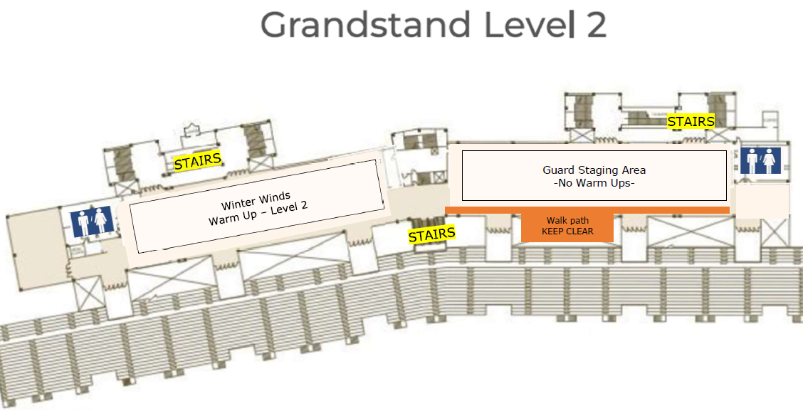 WEATHER PERMITTING - Percussion and Wind groups may opt to warm up outside on a first-come-first-serve basis. Staff MUST ensure that doors are secure at all times, as community members are known to enter GMC Stadium unauthorized. Please inform a GMC volunteer if you are taking your group outside so that they can help monitor doors.